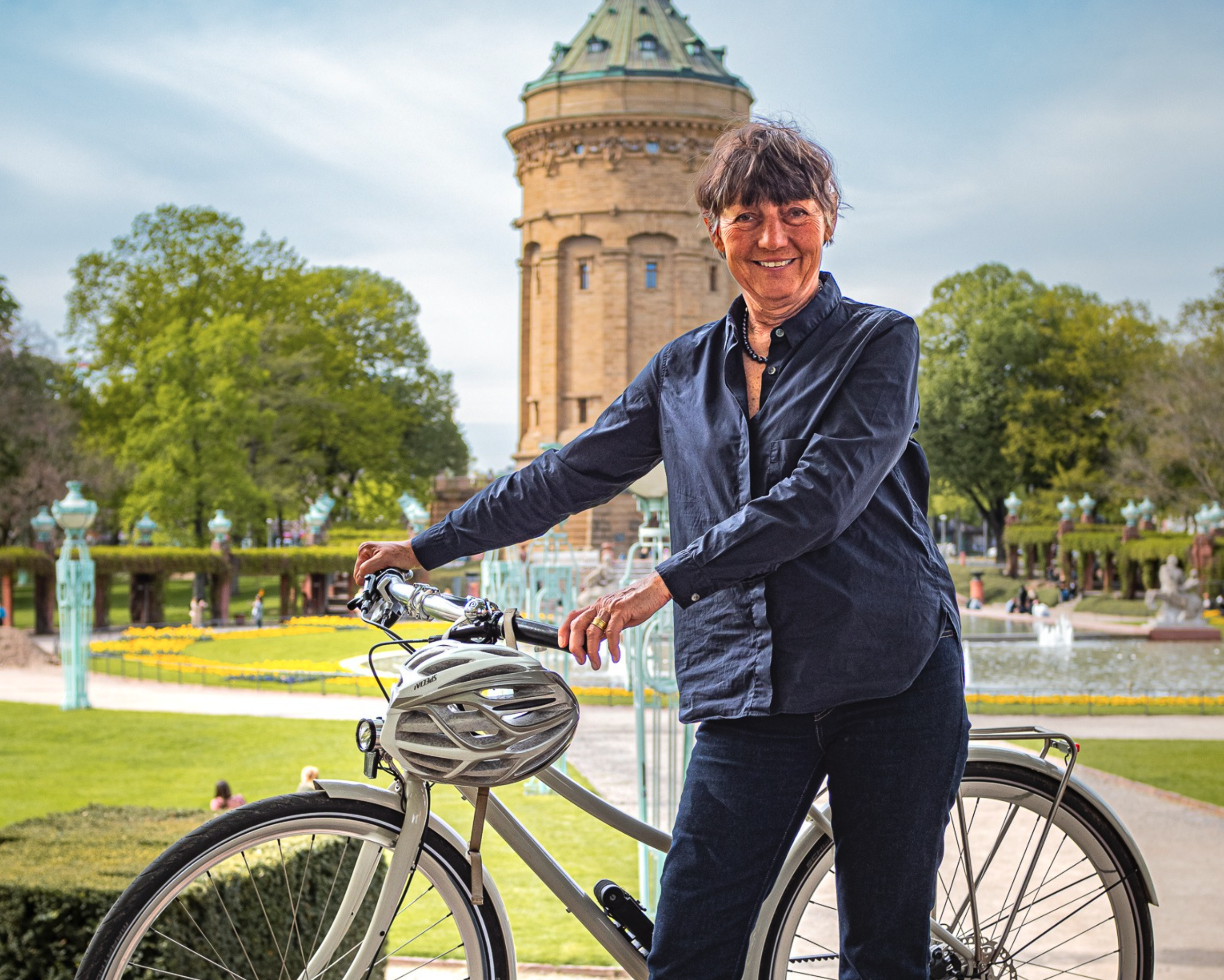 „Ob zur Stadtbibliothek, zum Markt oder einfach am Neckar entlang: Ich liebe es, mich in meiner Heimat Mannheim mit dem Fahrrad zu bewegen. Selbst Städte wie Kopenhagen, Paris oder gar Abu Dhabi entdecke ich am liebsten auf zwei Rädern – vor allem, seit ich in Rente bin. 2024 übernahm ich das neu geschaffene Ehrenamt als Fahrradbeauftragte der Stadt Mannheim. Für eine globale Vernetzung trat ich auf Wunsch der Stadt dem weltweiten Netzwerk der Bicycle Mayors bei. Mannheim hat gute Voraussetzungen für eine echte Fahrradstadt: Immerhin wurde das Fahrrad hier vor über 200 Jahren von Karl Freiherr von Drais erfunden. Heute gibt es viele engagierte Gruppen, fahrradaffine Stadtplaner, viele gute Ideen. Die Innenstadt ist aber noch immer geprägt vom Autoverkehr. Komplett autofreie Straßen – das traut sich die Stadt noch nicht. Mobilität sollte in all ihren Formen gefördert werden, die Straßen für alle Menschen da und sicher sein – vor allem für Kinder, Eltern oder ältere Menschen. Fahrradfahren sollte einfach sein und sich nicht wie eine Mutprobe anfühlen. In meiner Funktion als ehrenamtliche Fahrradbeauftragte höre ich Menschen zu, suche Lösungen und baue Brücken zwischen Verwaltung, Politik und Zivilgesellschaft. Ganz wichtig sind mir die regelmäßigen Netzwerktreffen wie der Runde Tisch Radverkehr, den ich moderiere. Hier arbeiten Fachabteilungen der Stadtverwaltung, Gemeinderatsmitglieder aller Parteien, verschiedene Fahrradinitiativen, der Allgemeine Deutsche Fahrrad-Club und Vertreter:innen der Industrie- und Handelskammer gemeinsam an fahrradfreundlichen Lösungen. Hier kann ich auch Ideen aus dem BYCS-Netzwerk einspeisen und sie auf lokale Bedürfnisse anpassen. Außerdem plane ich Plakataktionen, produziere Erklärvideos und unterstütze Kampagnen wie Uffbasse, also „Aufpassen“, die charmant, aber wirksam für mehr Rücksicht und Miteinander werben. Besonders am Herzen liegen mir Fahrradkurse für Erwachsene, speziell für migrantische Frauen. Bei ihnen sieht man, dass es beim Fahrradfahren und bei Mobilität allgemein um so viel mehr geht als nur um Fortbewegung. Es geht um die Möglichkeit, an der Gesellschaft teilhaben zu können. Und um Lebensqualität. Wenn der Durchfahrtsverkehr und im öffentlichen Raum abgestellte Autos weichen und mehr Grünflächen entstehen, lädt die Innenstadt auch wieder zum Leben ein – und nicht nur zum Durchfahren. Ich hoffe, dass ich mit meiner Arbeit zu einem positiven Miteinander aller Verkehrsteilnehmenden in der Stadt beitragen kann.“