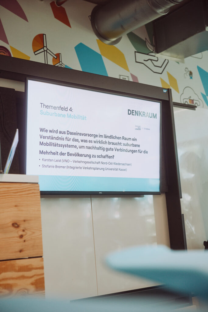 Eine Tür weiter, in Raum 227, beim Fokusthema Tourismus, steht für die Teilnehmenden fest, dass man Mobilität nicht als Pflicht begreifen sollte, sondern als Möglichkeit – für die Freizeit, für die Erholung, aber auch für die Wirtschaft. Der Erlebnisbauer erzählt, dass sein Hof jedes Jahr Hunderttausende Besucher anziehe – aber alle mit dem Auto kommen. „Es gibt keine Busverbindung, nicht mal für die Hauptveranstaltungen. So werden gute Ideen gleich eingemauert.“ Und die Gruppe sinniert über Lösungsansätze: Ein verpflichtender ÖPNV-Schlüssel für neue Freizeitangebote müsse her, heißt es, außerdem zusätzliche Angebote und Vorteile für ÖPNV-Nutzer:innen – Premium-Busse, die direkt ins Wandergebiet fahren. Shuttle-Systeme, die im Urlaub dein Gepäck übernehmen, mehr Kooperationen zwischen Hoteliers und Verkehrsverbünden.