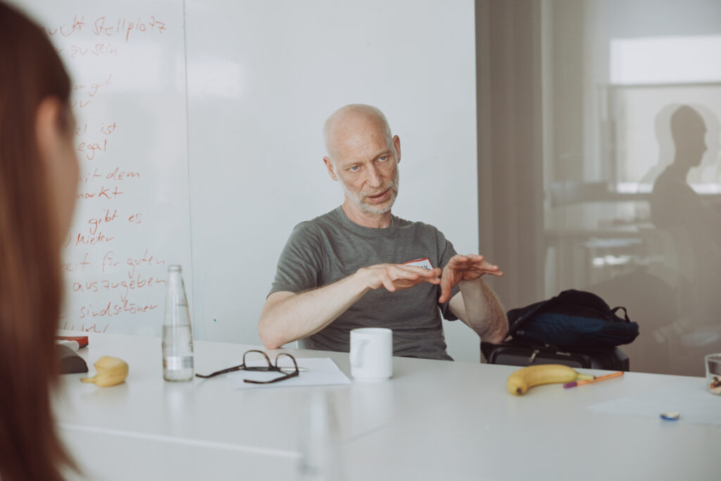 Ein Teilnehmer schafft es nicht pünktlich zum Start des Workshops, er steckte bei Stuttgart im Stau, schreibt er in einer SMS. Zwei weitere Teilnehmende sitzen im verspäteten Zug. „War ja klar“, sagt jemand, lacht, hört sich dabei aber nicht leicht an. Andere, die mit den Öffis angereist sind, stöhnen. Schon früh am Morgen kratzte das Thermometer an der 30-Grad-Marke. Die Tram war überfüllt, die alten Kippfenster viel zu klein. Dabei wäre es gerade heute wichtig, einen kühlen Kopf zu bewahren: