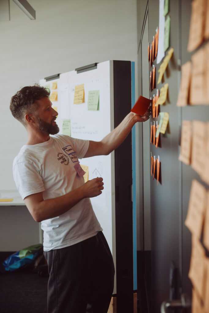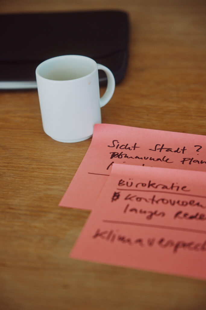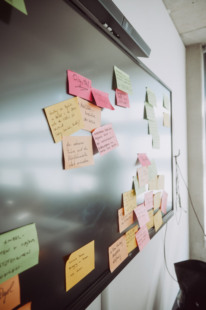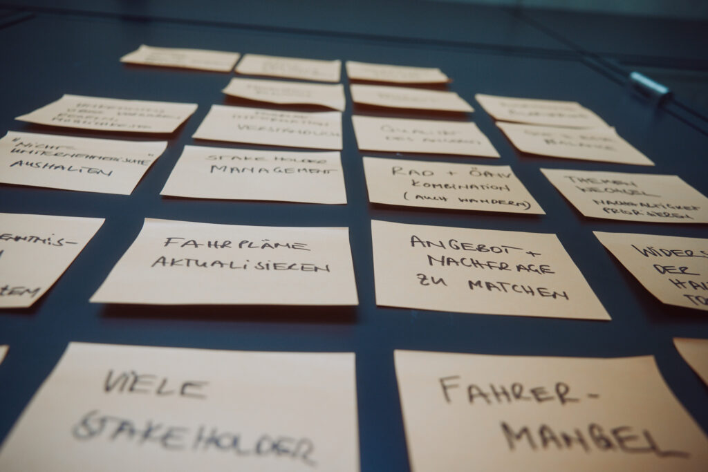 Ideen überlagern sich, Notizzettel doppeln sich, werden übereinander fixiert, spontan umsortiert, Thesen rekonstruiert, abgerutschte Zettel hastig neu fixiert. Eine Teilnehmerin fotografiert die Ideensammlung ab, falls die Klebestreifen nicht halten – sicher ist sicher. Prozess statt Perfektion. Aber mit jedem Klebezettel wächst die Vision. Einer sagt: „An Knotenpunkten bräuchte es eine Kompetenzstelle Bahnhofsvorplatz, die Handel und Verkehr zusammenbringt.“ Eine Teilnehmerin ergänzt: „Oder Mobilitäts-Incentives an der Supermarktkasse: Wer mit dem Bus kommt, bekommt den Liter Milch 20 Cent günstiger.“ Und warum gibt es immer noch keine Mietlastenräder, die man einfach überall abstellen kann?